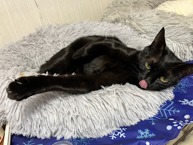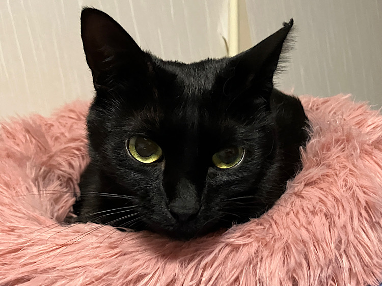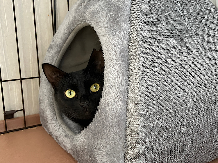 黒猫らしい慎重派。人馴れしていない素振りで、こちらを観察。でも手からおやつを食べたり、顎の下を撫でてもらうのが好き。フレフレ棒が怖いので、カフェデビューはできないかも。おっとり系か、シニアの先住猫さんのいるお宅を希望。