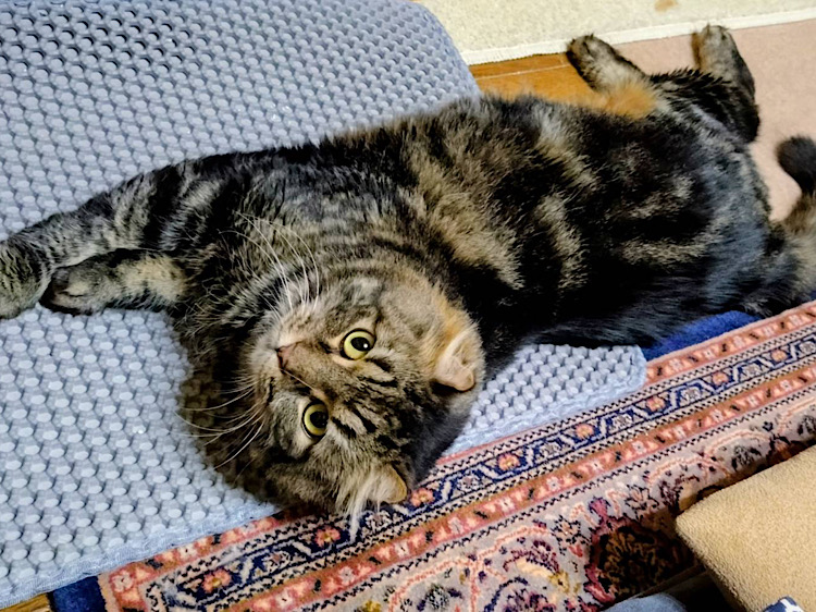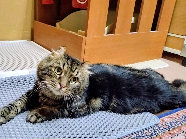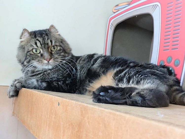 人や猫も大好きなおだやかな性格の猫です。ご飯の時間になると可愛い鳴き声で甘えて催促してきます。非常に食いしん坊で、出した分だけすぐ完食してしまいます。捕獲時に骨盤骨折で保護された状態であったようですが、その後自然に歩けるようになり、現在状態観察中です。推定7歳のイケおじな猫です。