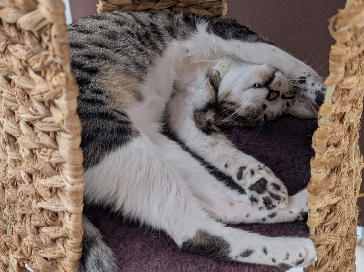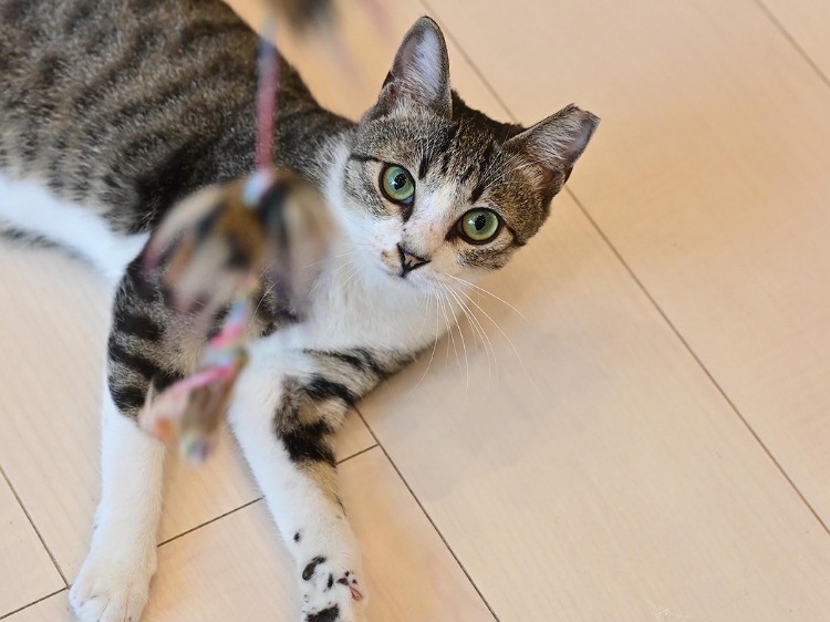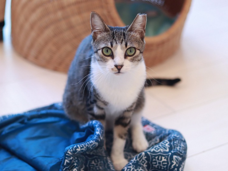 小柄なのに自分の身体より大きな猫ベッドをくわえて運んだり、カフェでも大きなお兄ちゃん達とにゃんプロしたりいつも元気な女の子。甘えてお膝に乗ってきたりもします。仲良しの武田ツキくんと一緒のお家。新しいお名前は《ベイまる》ちゃん