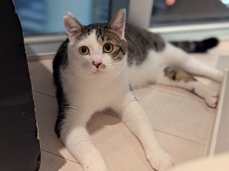 いつも控えめで他の猫さんに優しい穏やかなツキくん。なでるとすりすりゴロゴロしてくれます。おもちゃでもよく遊び、部屋の中をダッシュするなどやんちゃな一面も。仲良しのマルハンまる子ちゃんと一緒のお家。新しいお名前は《スターマン》くん