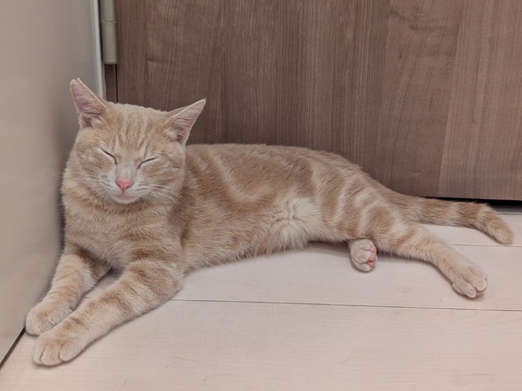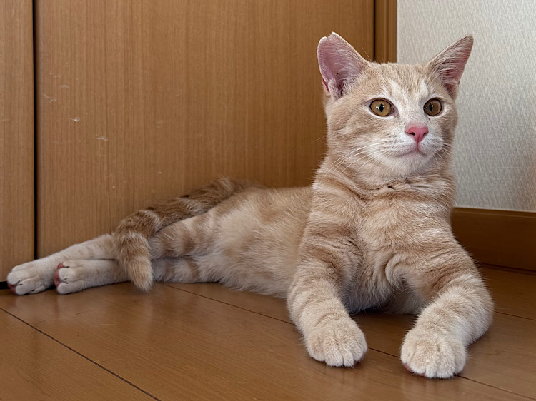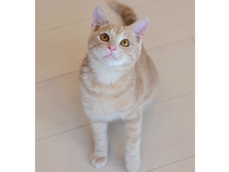 人が大好きで甘えん坊の優しい子です。玩具を見つけると表情が凛として、夢中になって遊ぶ小さなハンターに変身します。夢中になっている時でも思いやりを忘れず、他の猫ちゃんに玩具を譲ってあげたり、私たちのところへ持ってきて渡してくれます。穏やかなとても可愛らしい猫です。